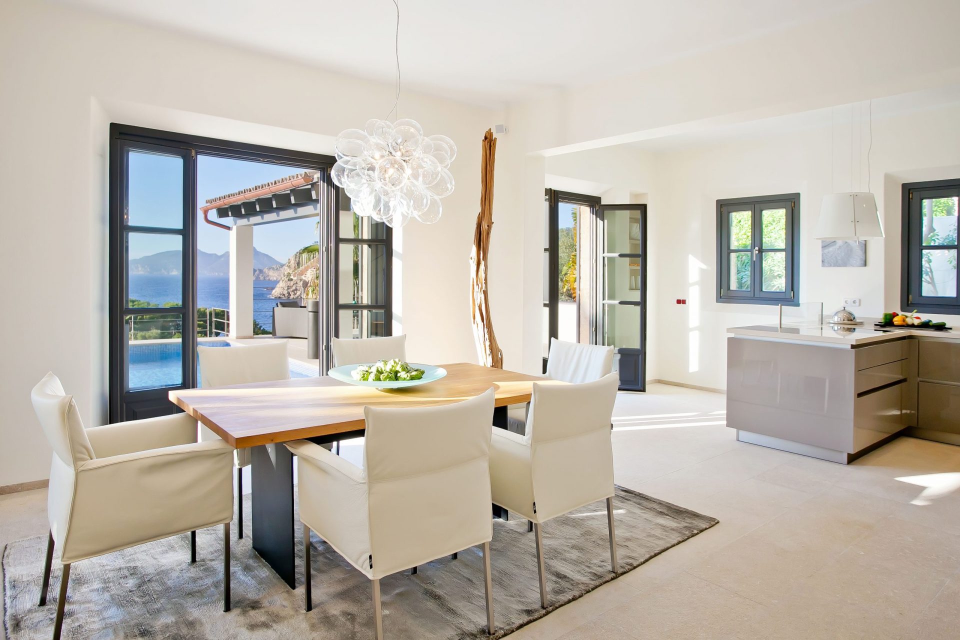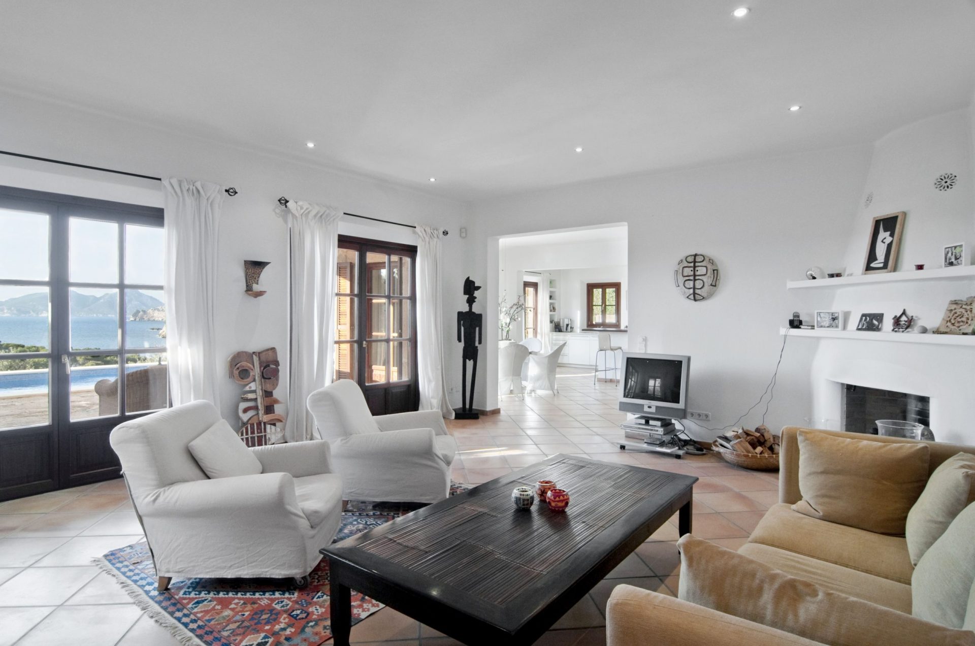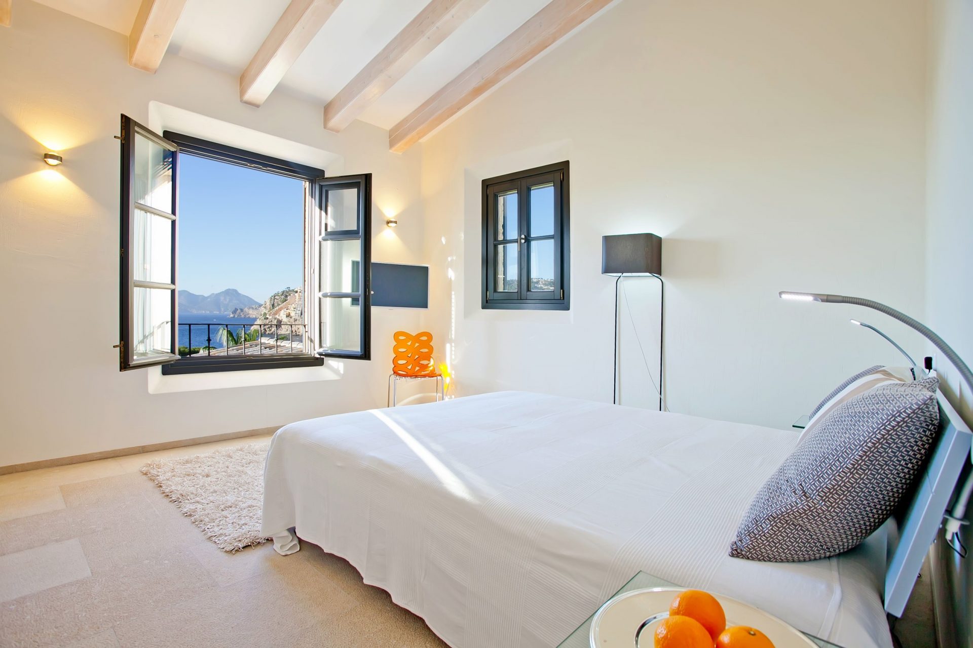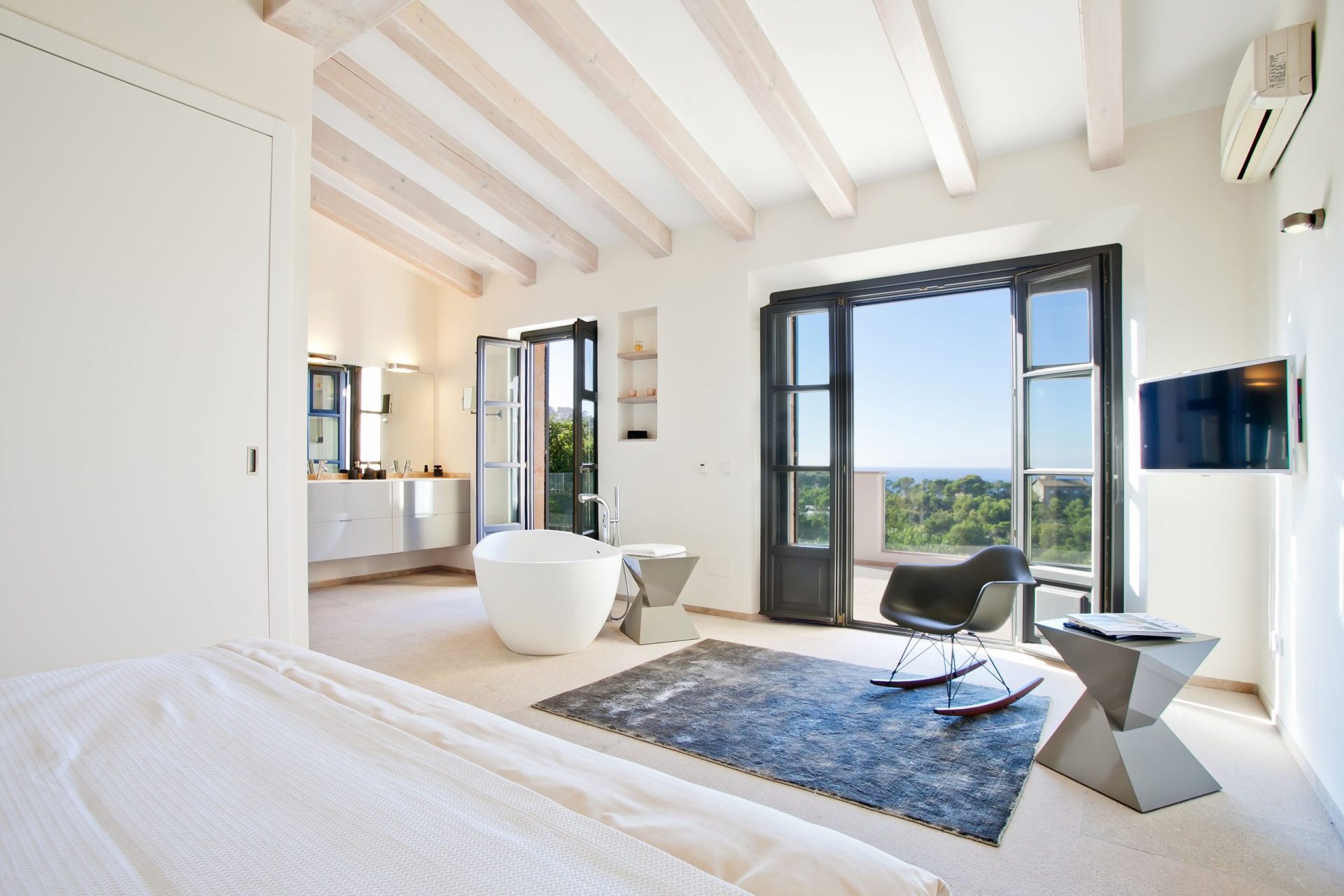 Dem gesamten Innenbereich wurden helle Wände, Steinböden, weiße Holzbalken und große Fenster hinzugefügt, um eine helle und geräumige Atmosphäre zu schaffen. Zudem verfügt die Villa über drei Schlafzimmer mit en-suite Badezimmern, von denen aus man den wunderschönen Ausblick genießen kann.
