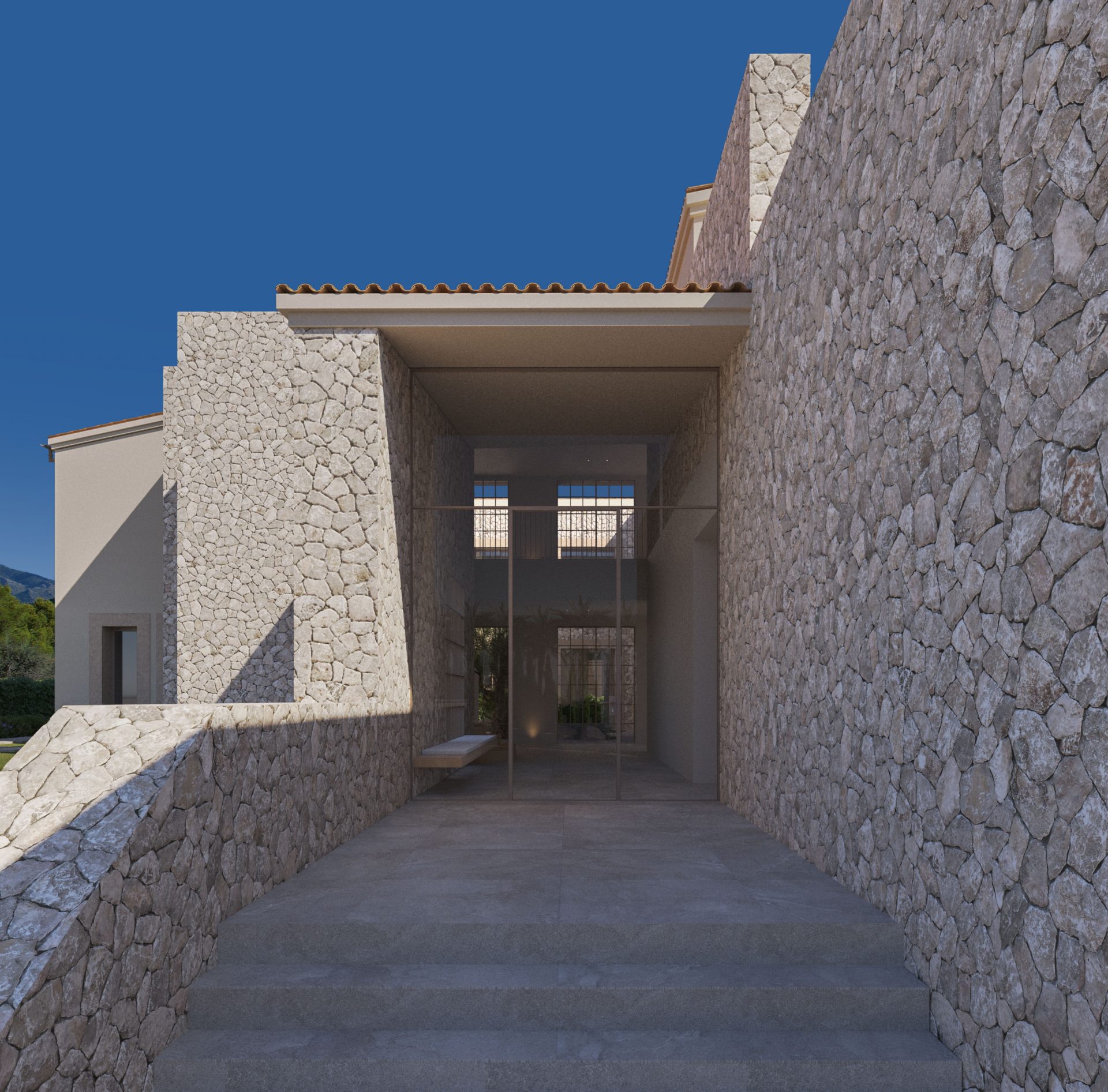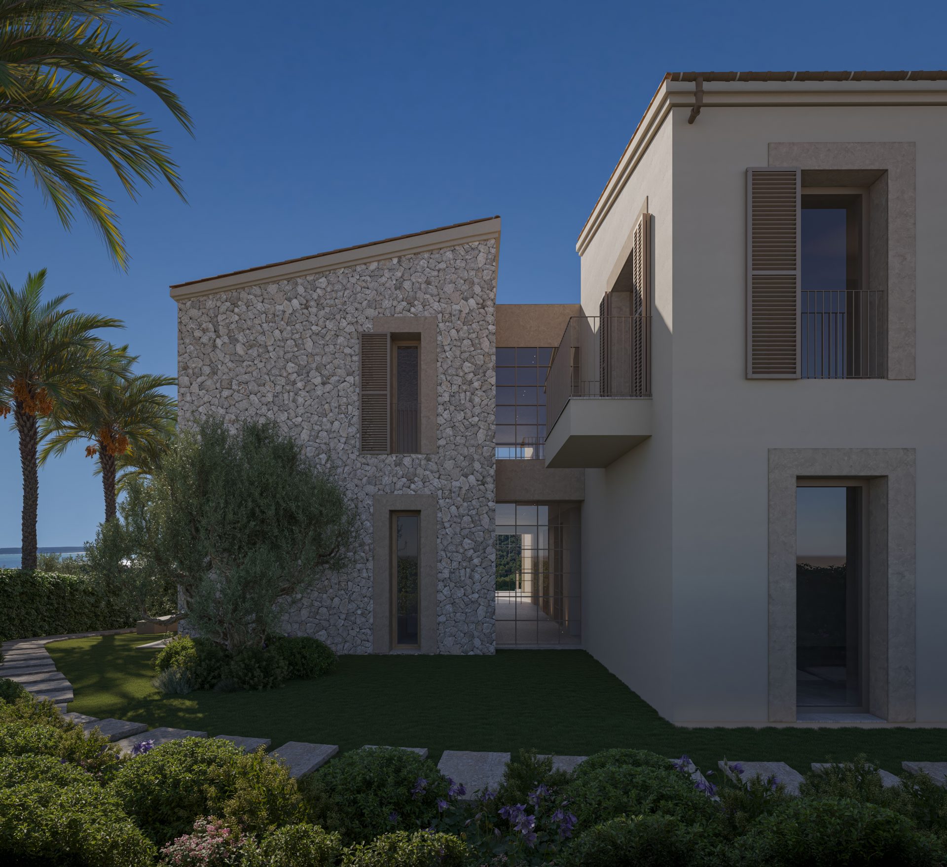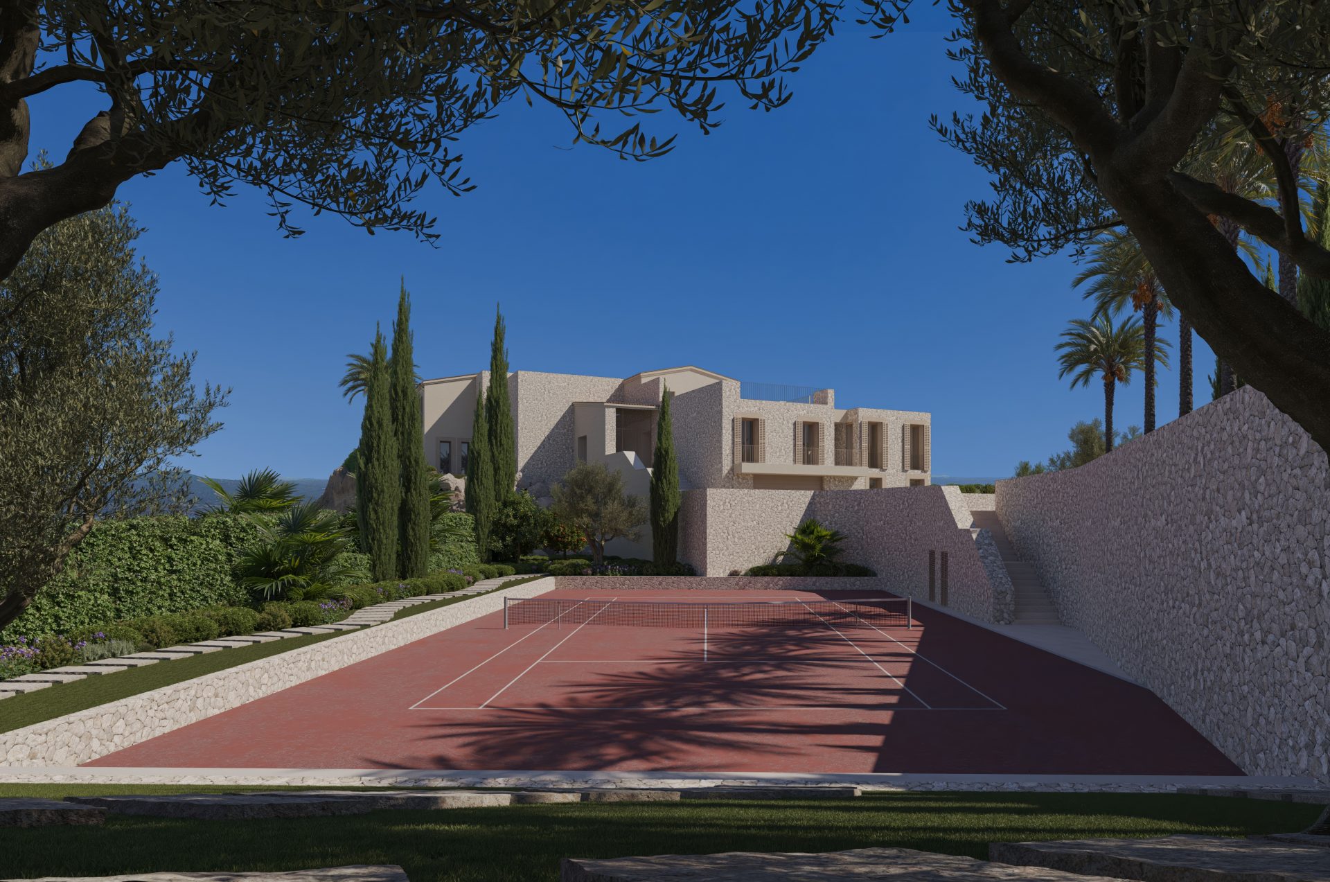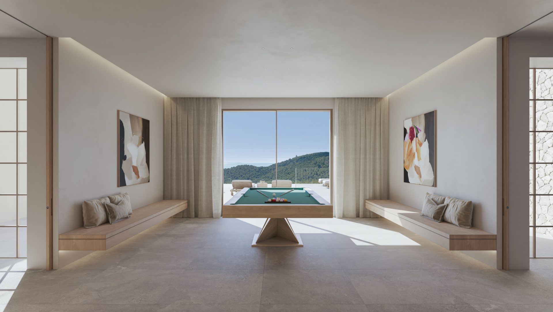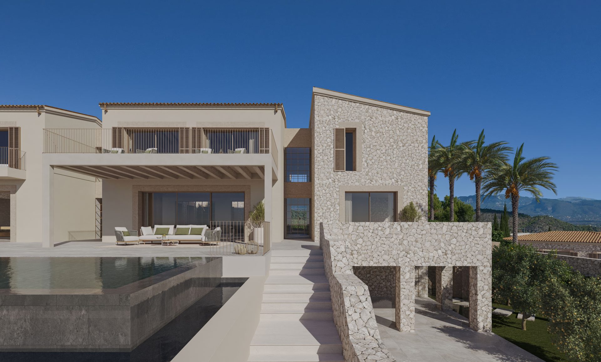 Das Interieur überzeugt mit ungewöhnlicher Weite und Offenheit, hohen Räumen und viel Licht. Die Terrasse mit Infinitypool ist nach Süden ausgerichtet, sowie alle Schlafräume, die ebenfalls über eine eigene überdachte Terrasse verfügen.