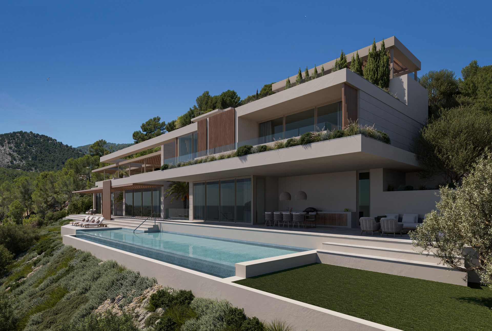 Die moderne Architektur, kombiniert mit stilvollen Holzelementen und erlesenen Materialien, verleiht jedem Objekt einen einzigartigen Charakter. Die großzügigen Außenbereiche laden dazu ein, den atemberaubenden Ausblick zu genießen und die Ruhe der Umgebung in vollen Zügen zu erleben.