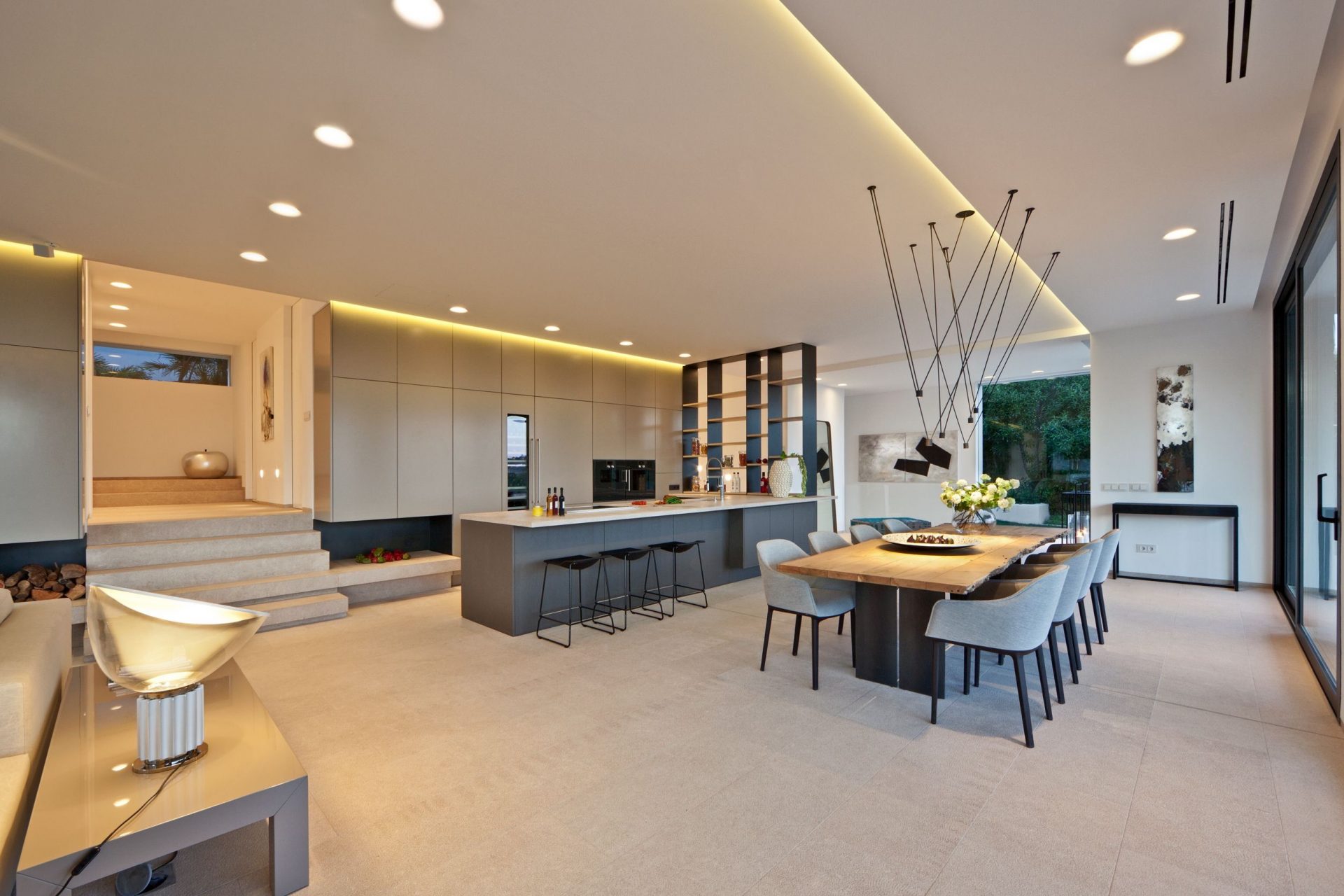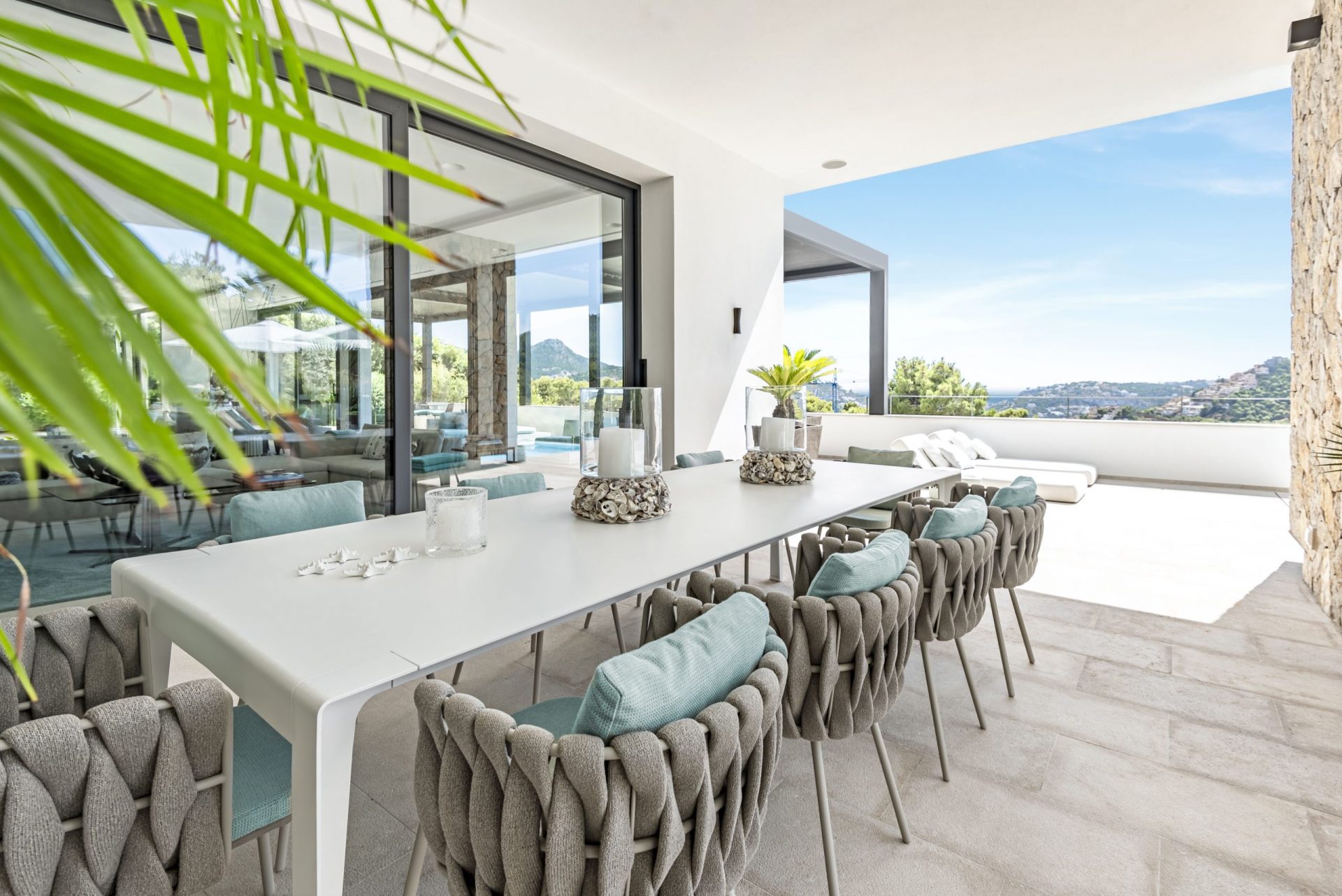 Der Hauptwohnbereich ist offen gestaltet mit einer großzügigen Terrasse, die zu einem Infinitypool führt. Im Obergeschoss befinden sich vier Schlafzimmer und vier Bäder, darunter die Master Suite mit eigener Terrasse.