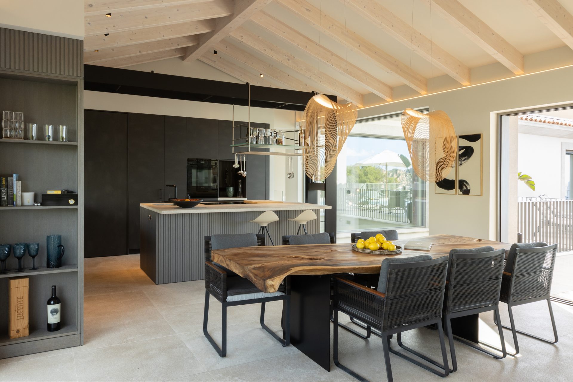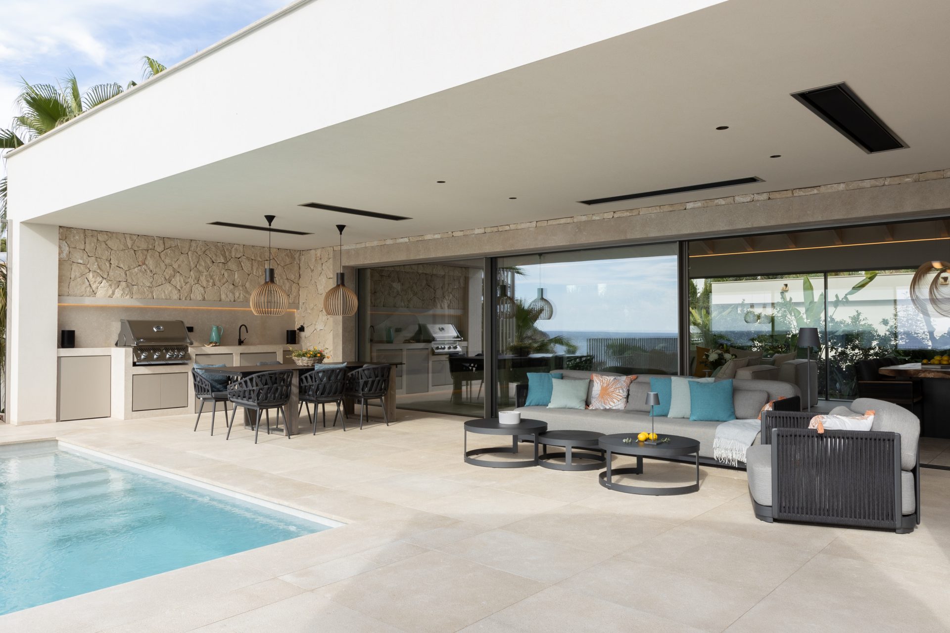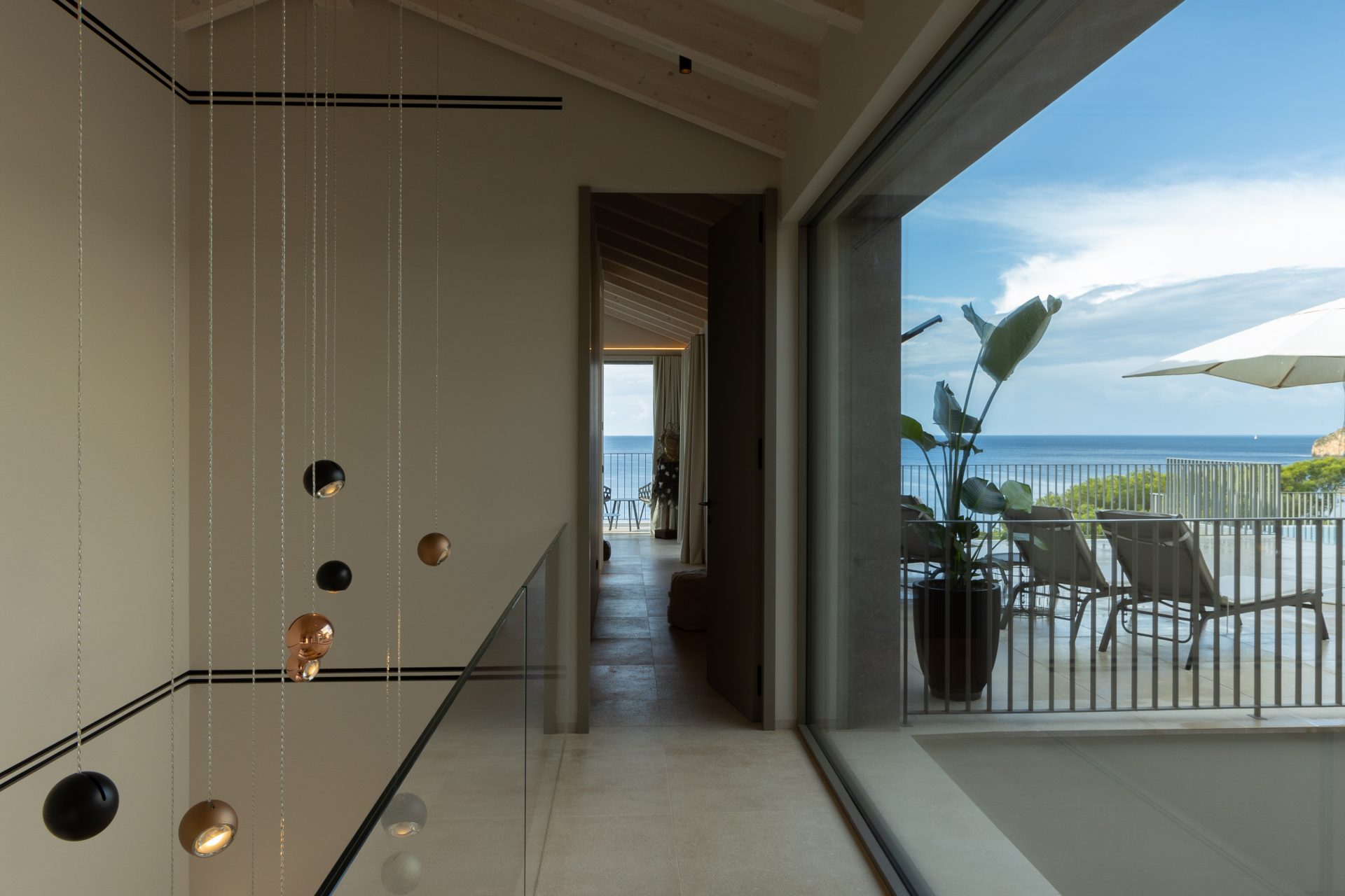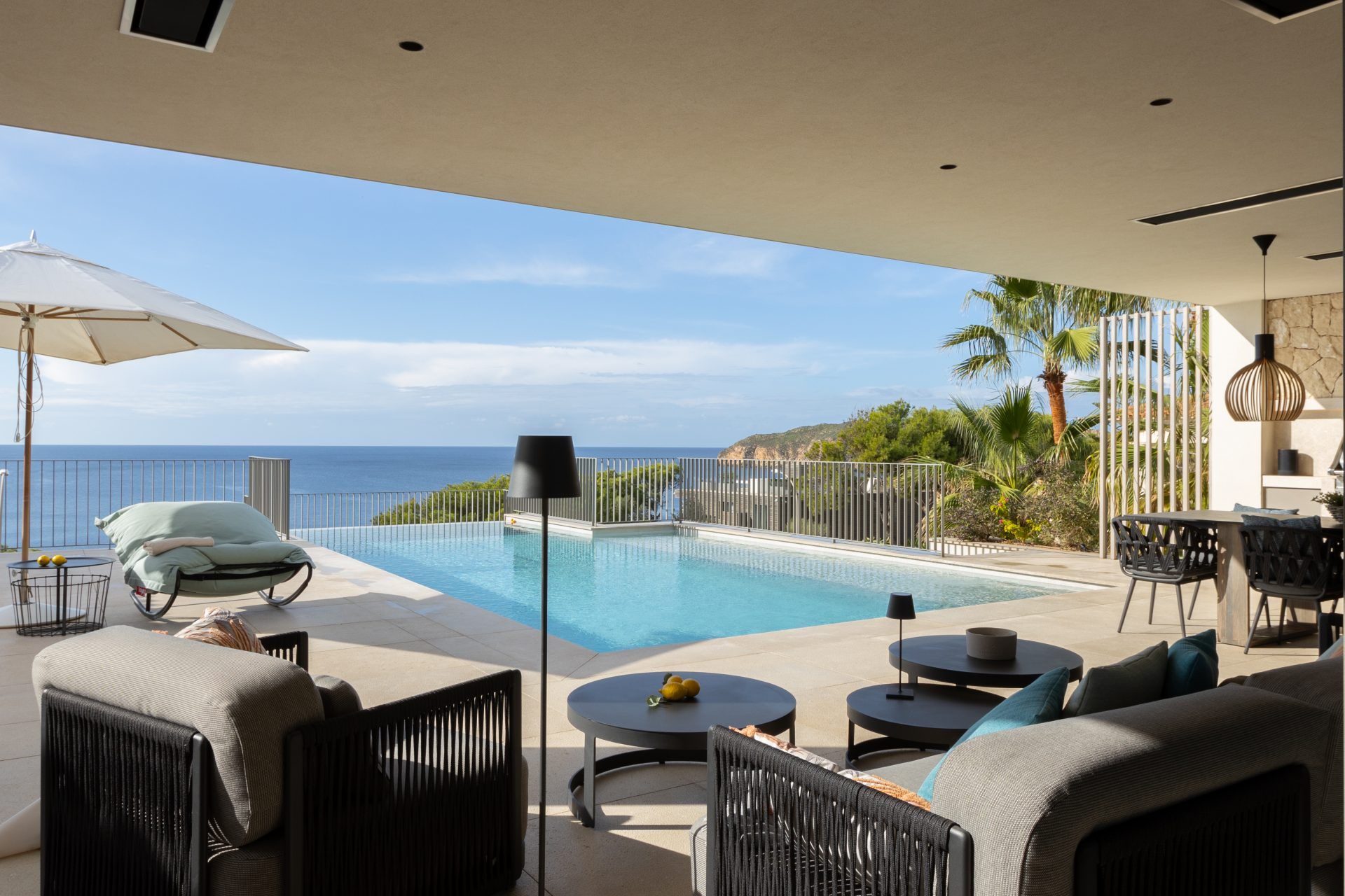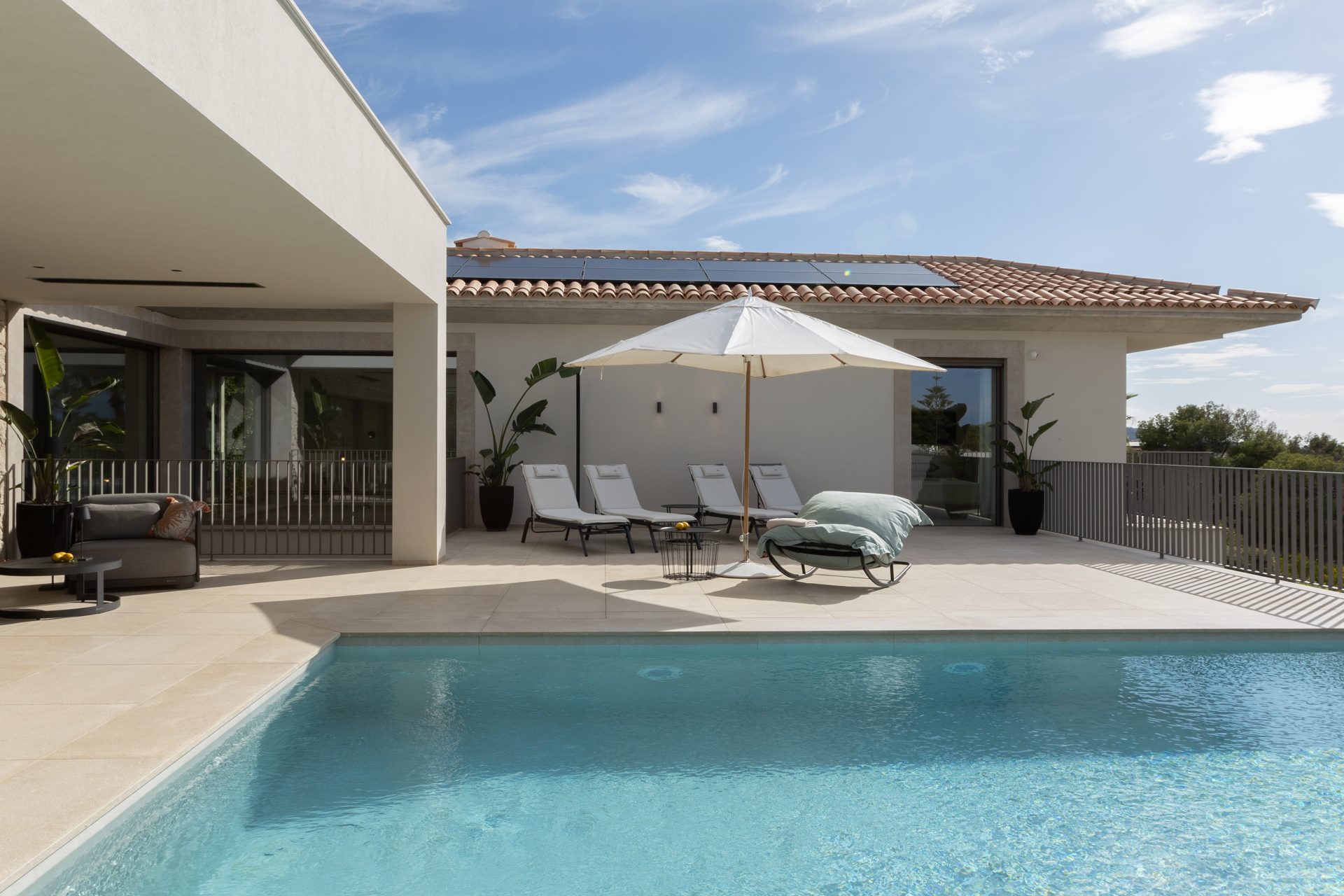 An elegant single-family home in Santa Ponsa with stunning views of the Malgrats Islands. This property combines Mediterranean design with modern elements and high-quality natural stone accents. The light-filled interiors and open-plan layout create a warm and inviting atmosphere.