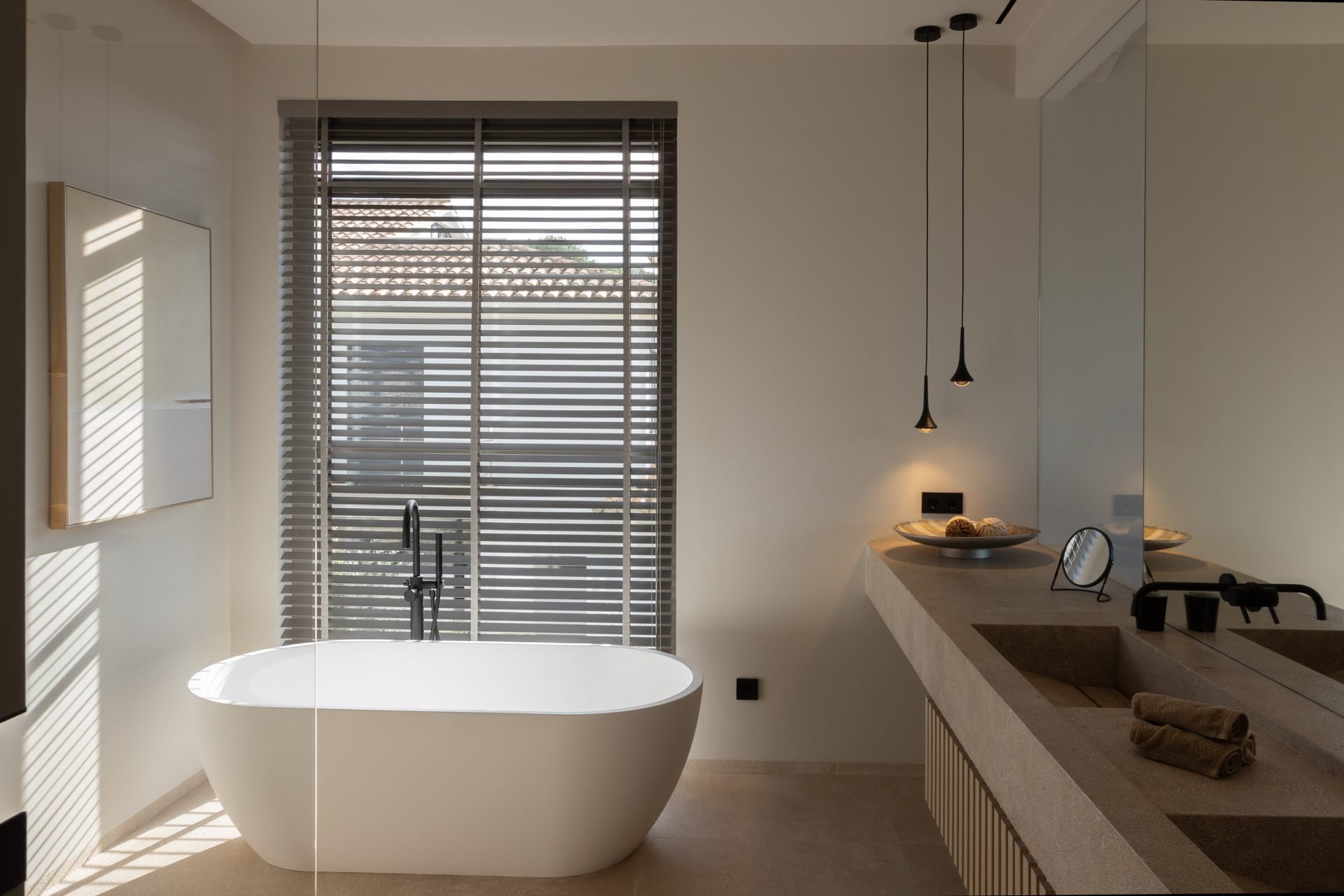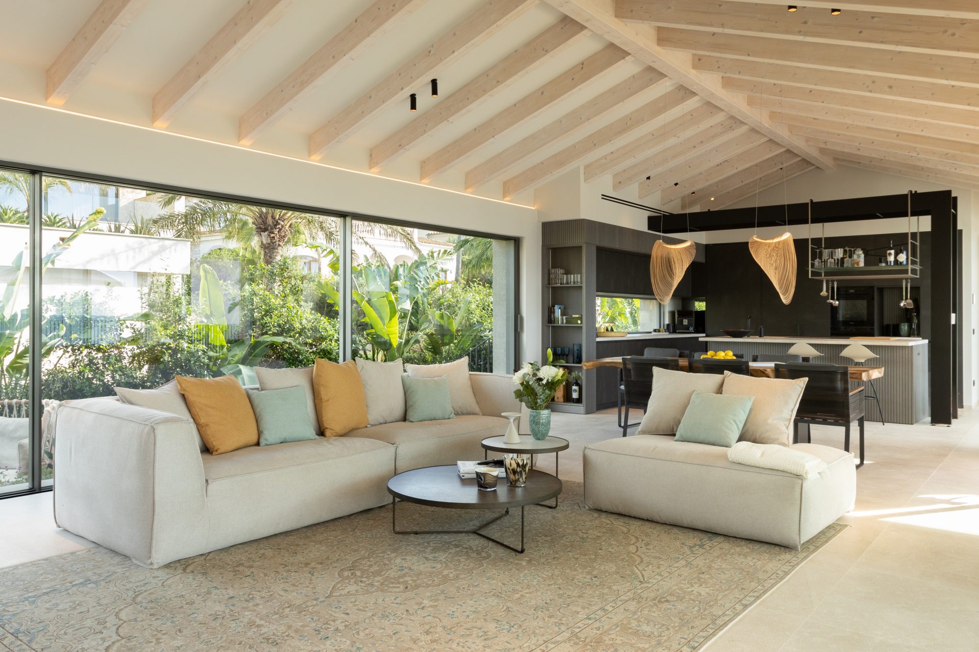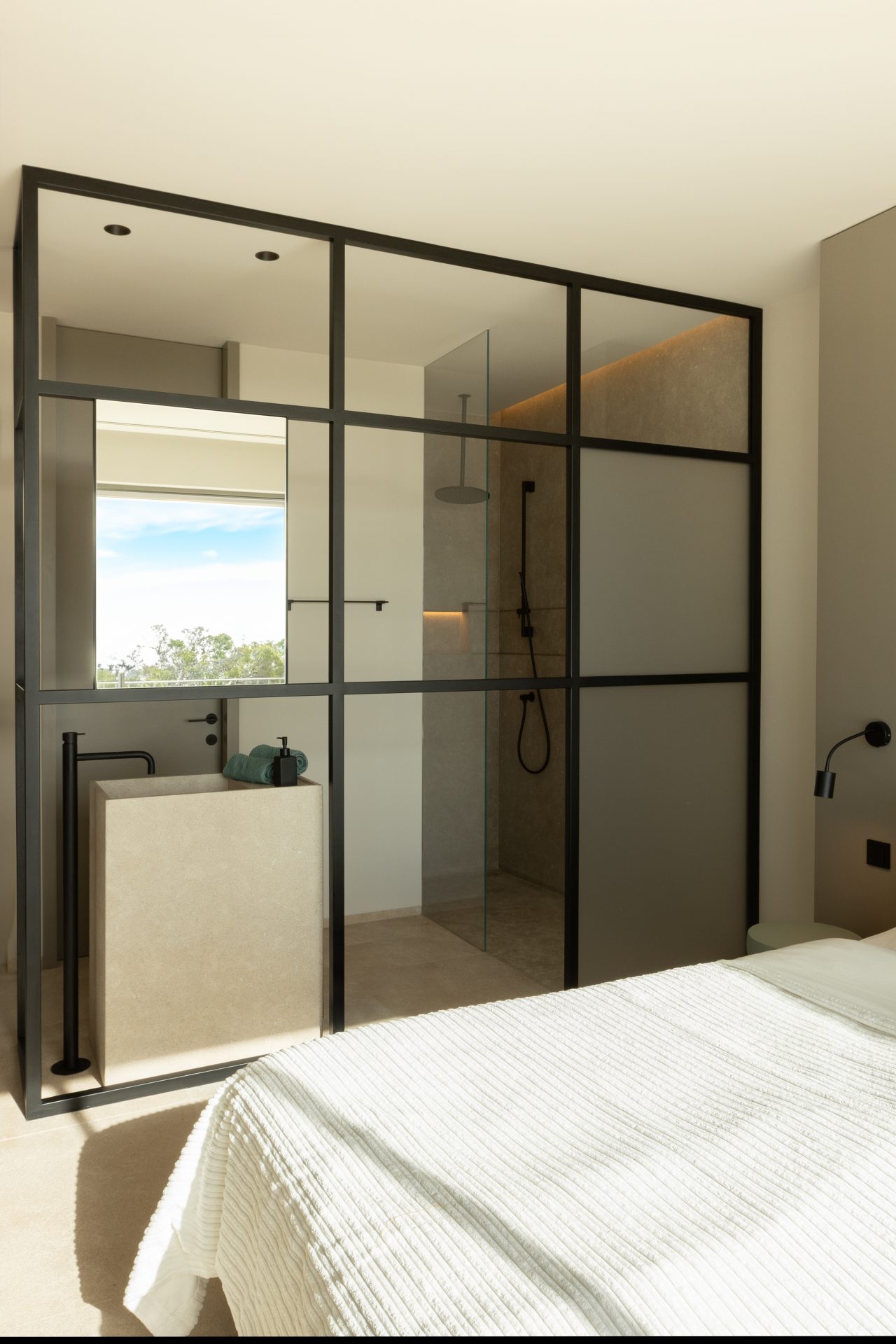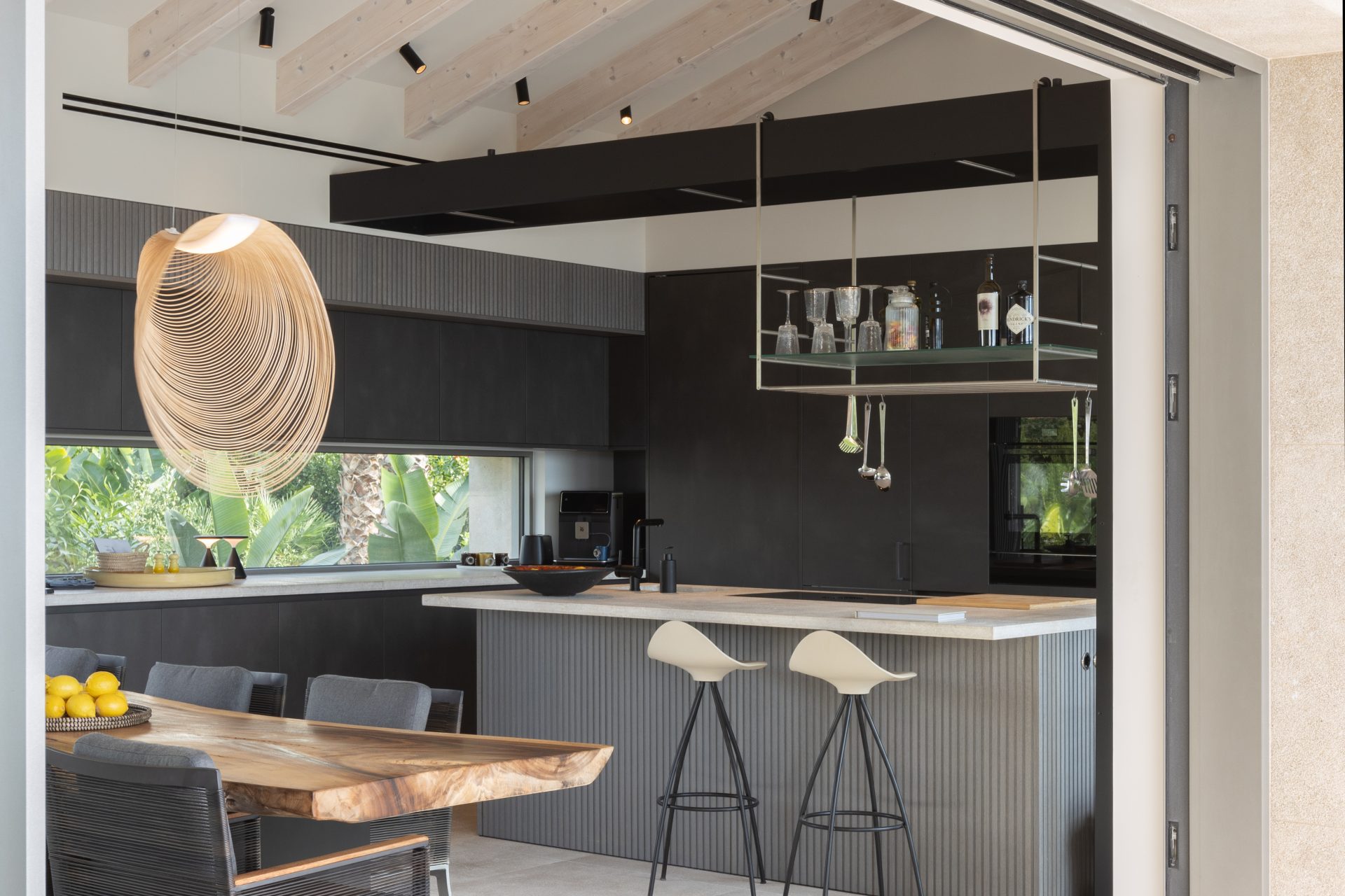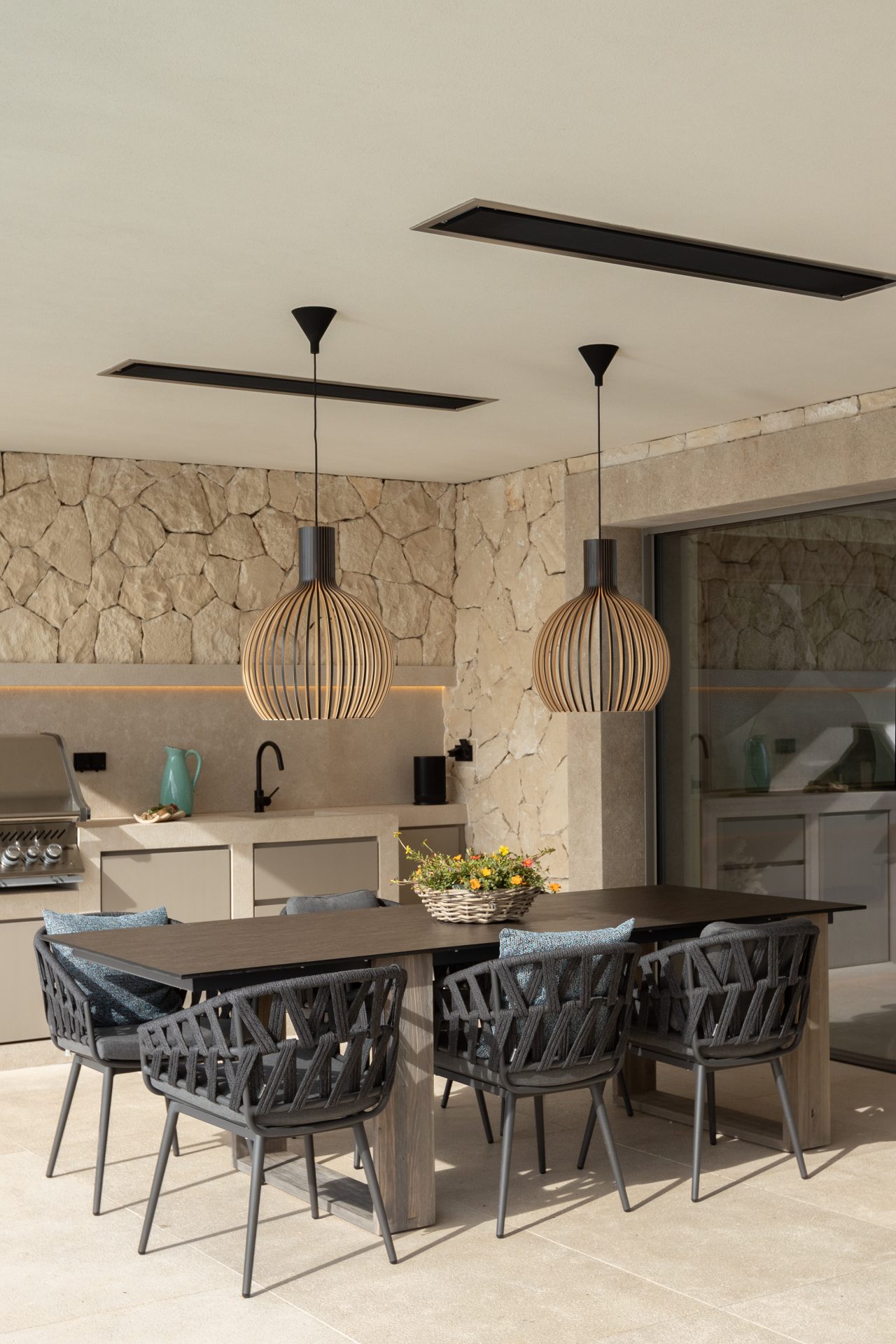 An elegant single-family home in Santa Ponsa with stunning views of the Malgrats Islands. This property combines Mediterranean design with modern elements and high-quality natural stone accents. The light-filled interiors and open-plan layout create a warm and inviting atmosphere.