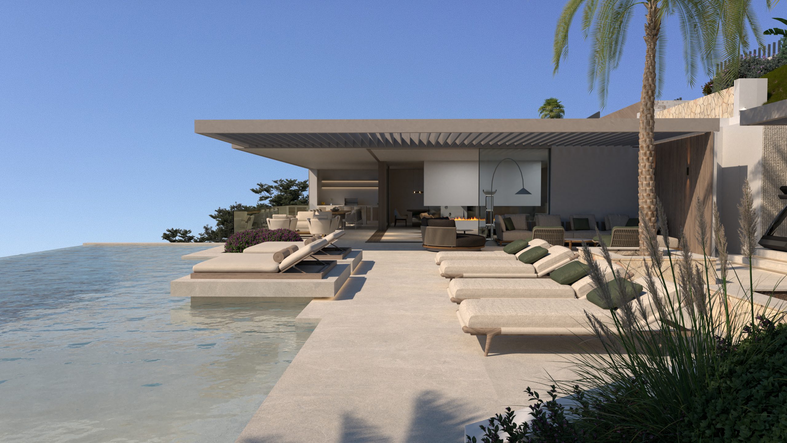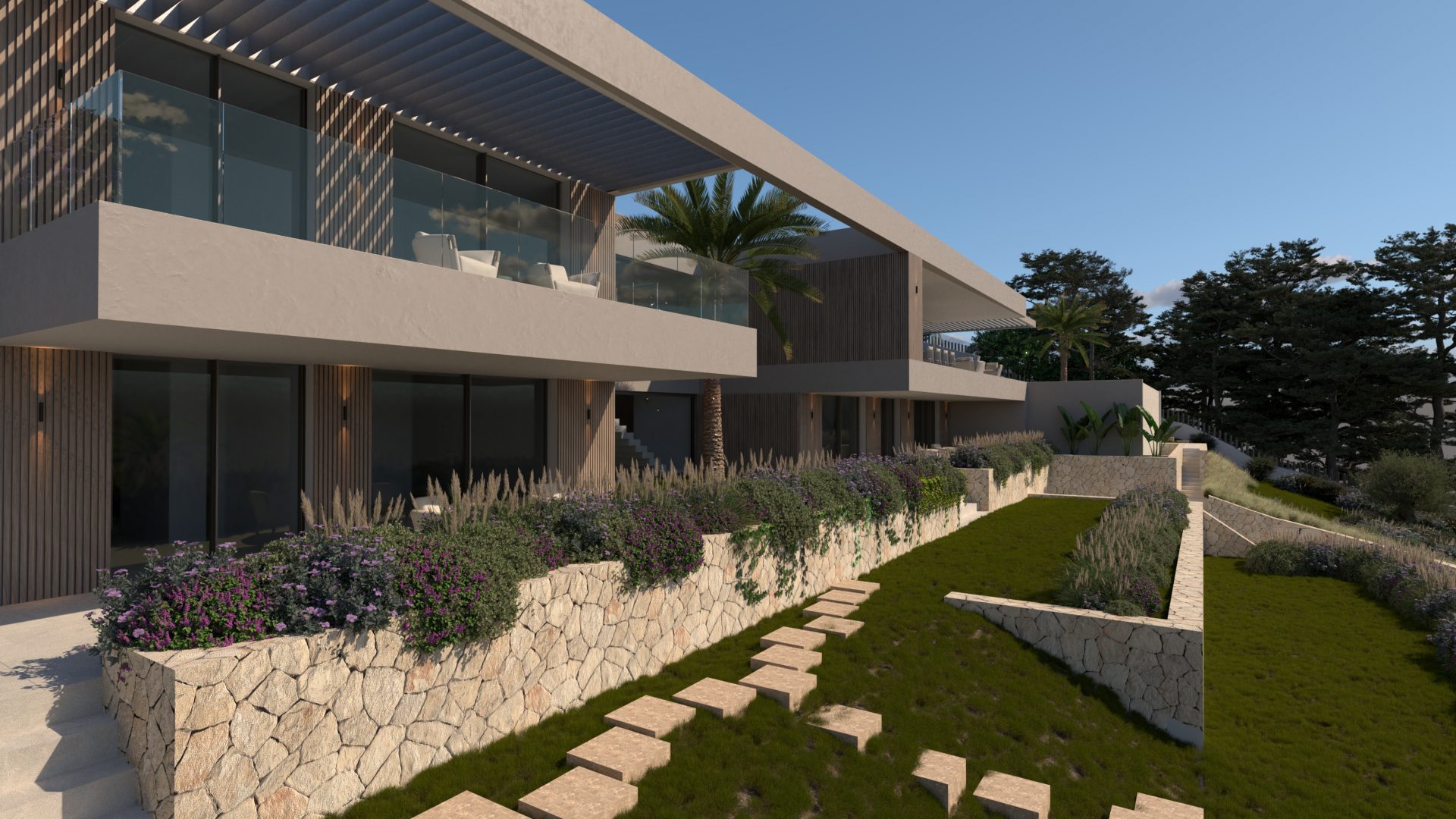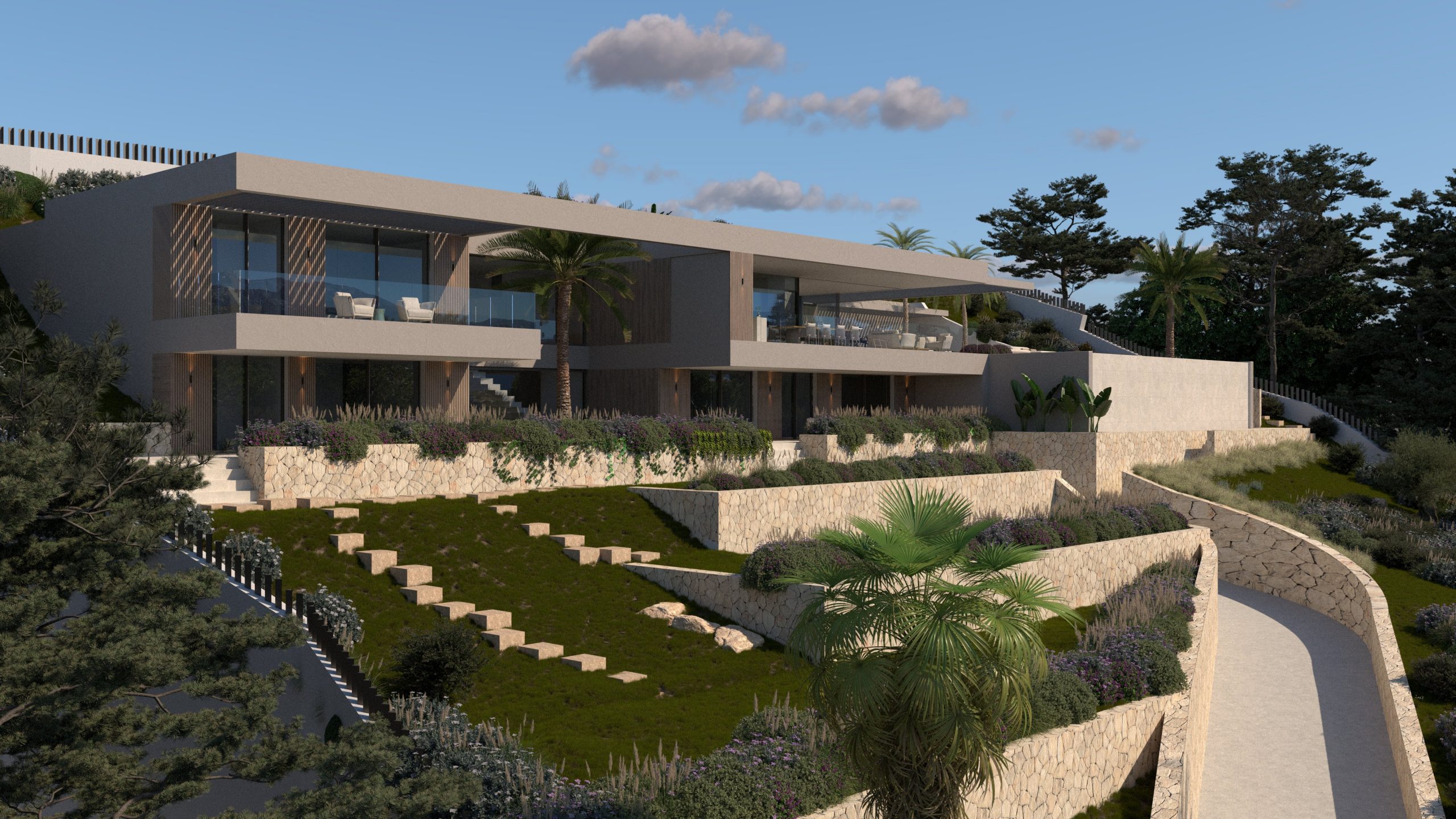 This elegant project in Santa Ponsa impresses with clean lines, natural stone, warm wooden elements, and expansive glass surfaces for unobstructed views of the sea and the Mediterranean landscape.