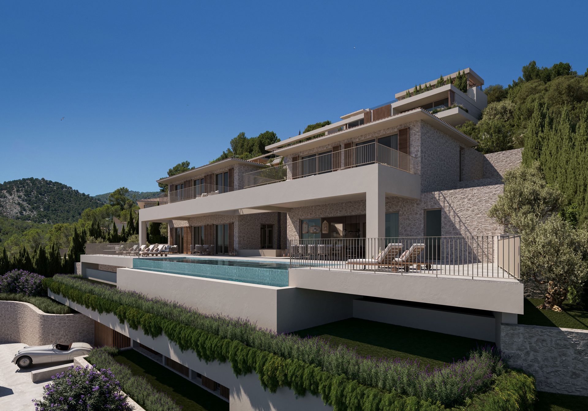 The natural stone on the façades of Azure and Indigo lends the properties an unrivalled timeless elegance. The varied structures of the stone also create a natural and harmonious appearance. The typical Mallorcan shutters also offer a refined, classic look and set stylish accents.