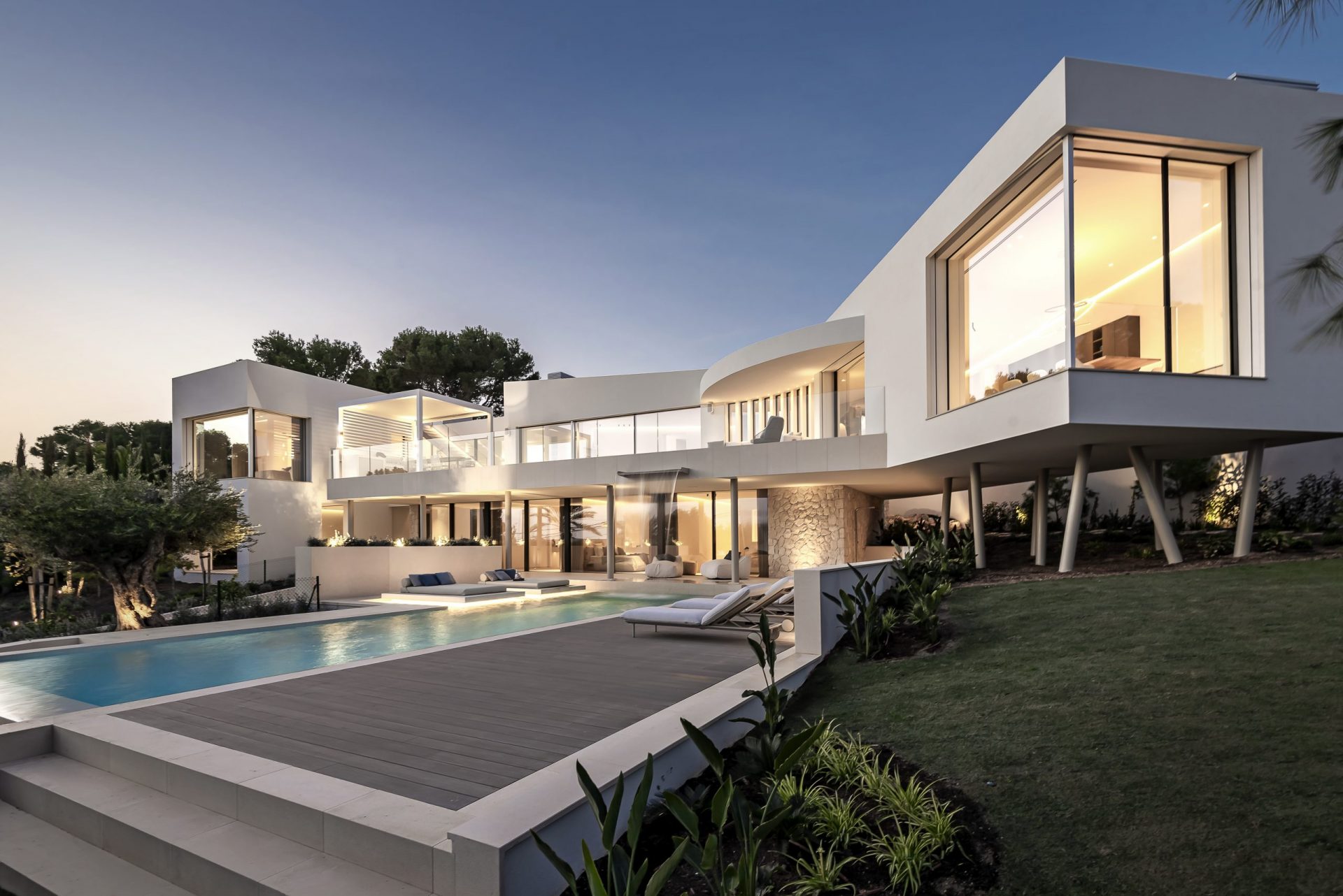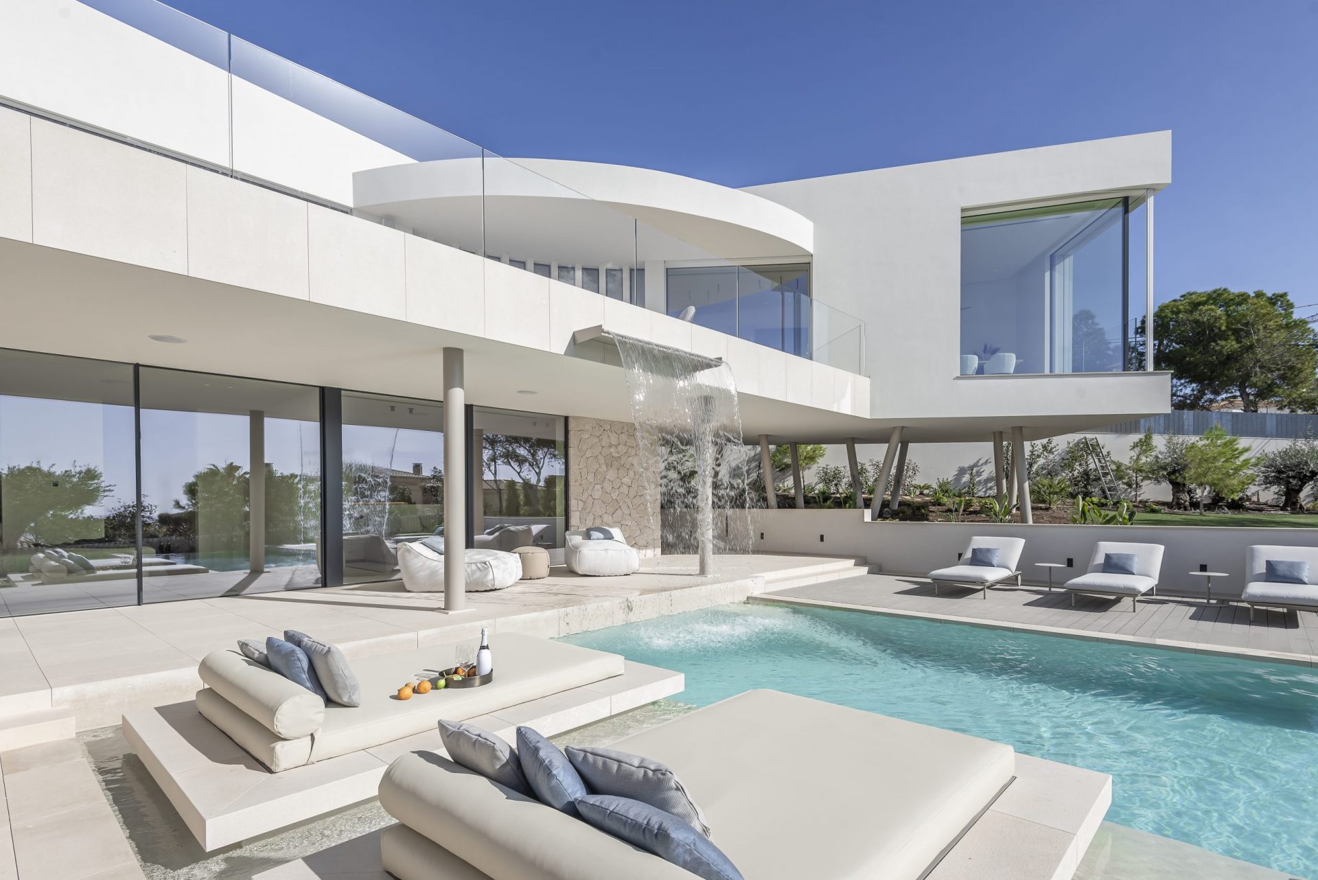 Cap Negret is an extraordinary project in Santa Ponsa. Multiple cubic elements and extraordinary design form a modern look. An outstanding feature is the built-in waterfall which flows from the master terrace into the grand pool.