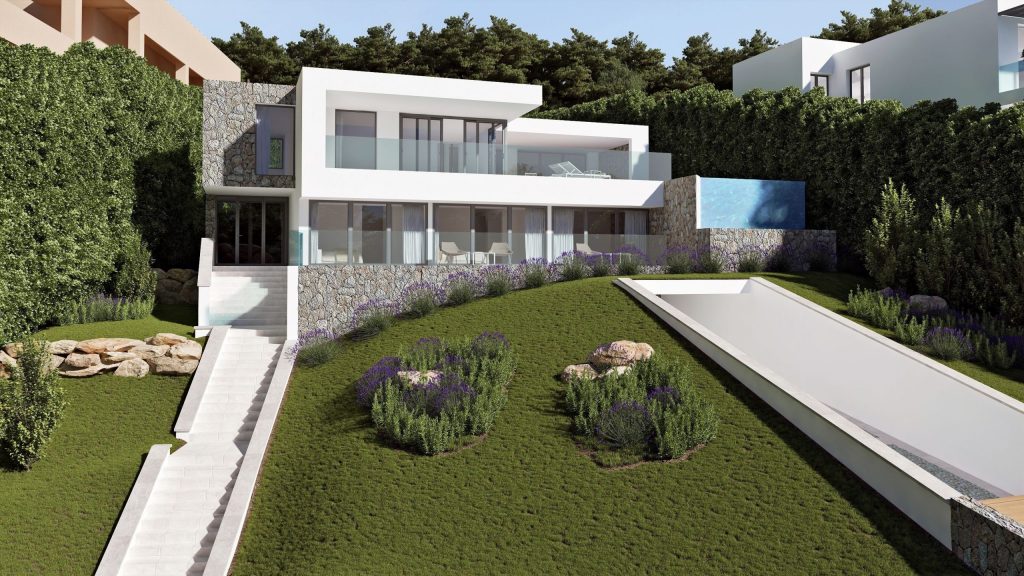 This striking contemporary villa is located close to the picturesque Santa Ponsa harbour with views across the bay. The topography of the plot has inspired the beautiful design. Its bold square shape with strong lines stands in contrast to the natural stone facing along the lower level and at both ends of the façade.