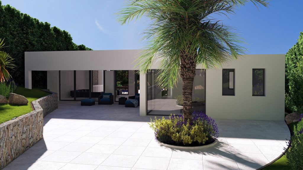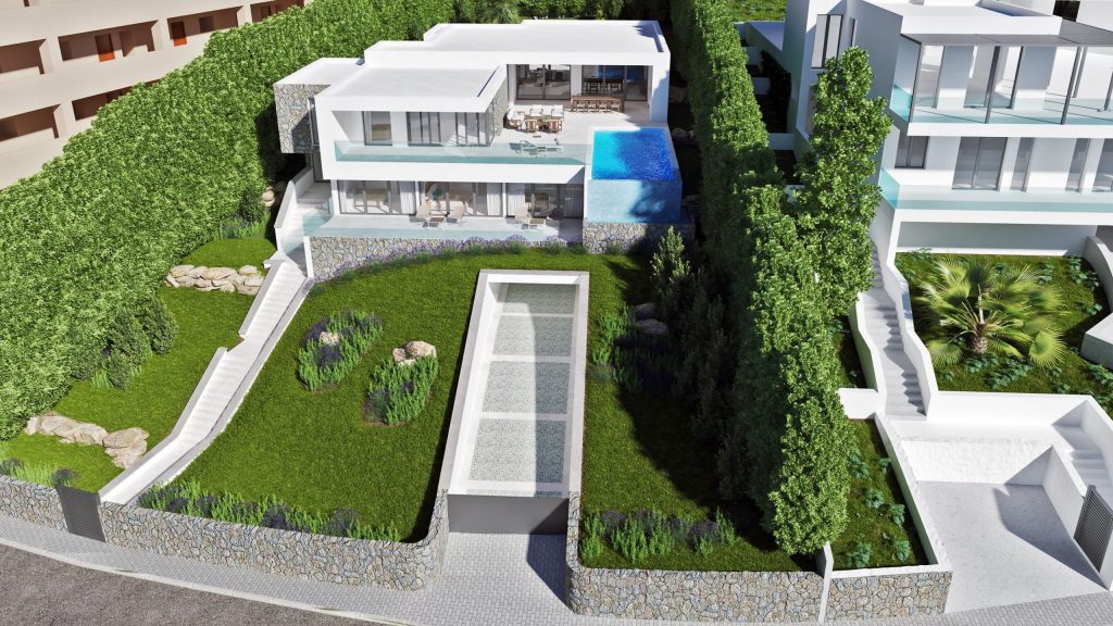 Built on two levels, with the bedrooms on the lower level and the main dining/living areas on the upper level, the design ensures maximum views from every room in the villa. It provides one large seamless space that leads onto the exterior terrace, outside dining and infinity pool area. In addition, there is an underground parking area from the street and a walkway to the entrance of the house up the sloping Mediterranean garden that surrounds the property.