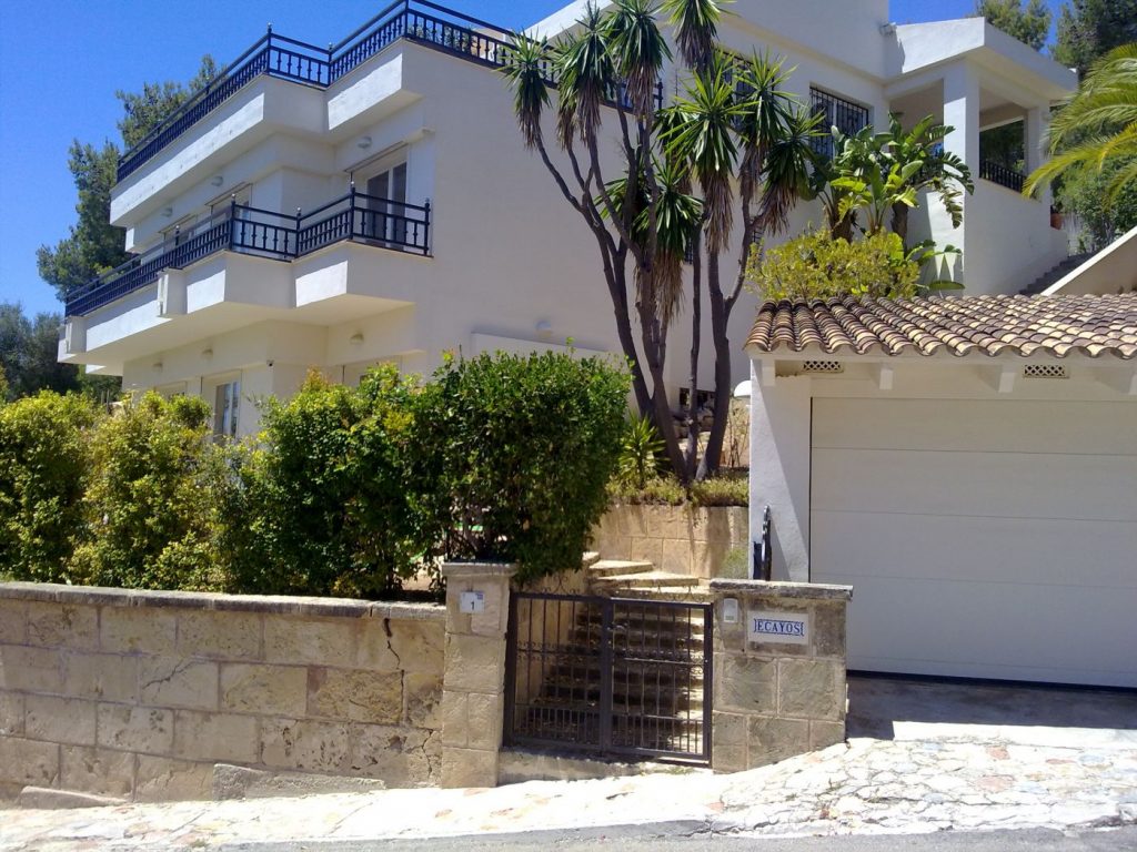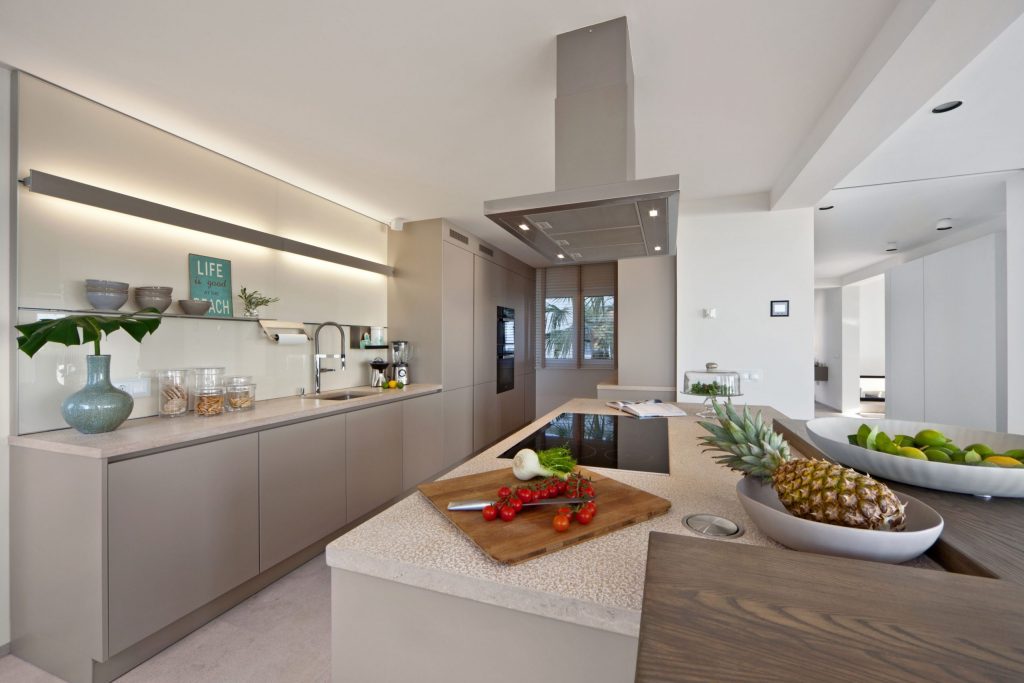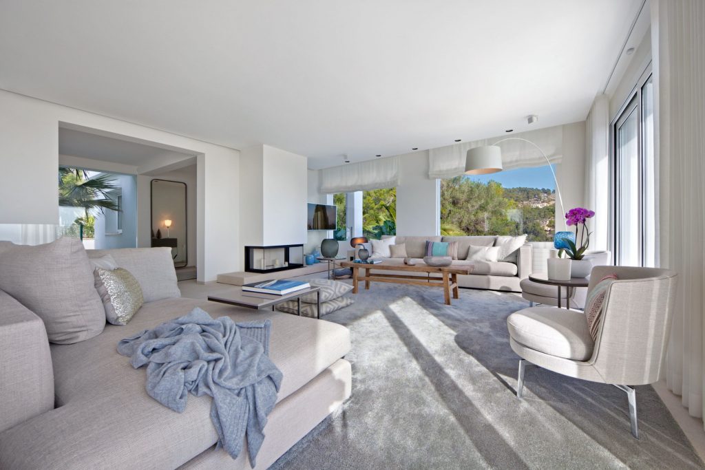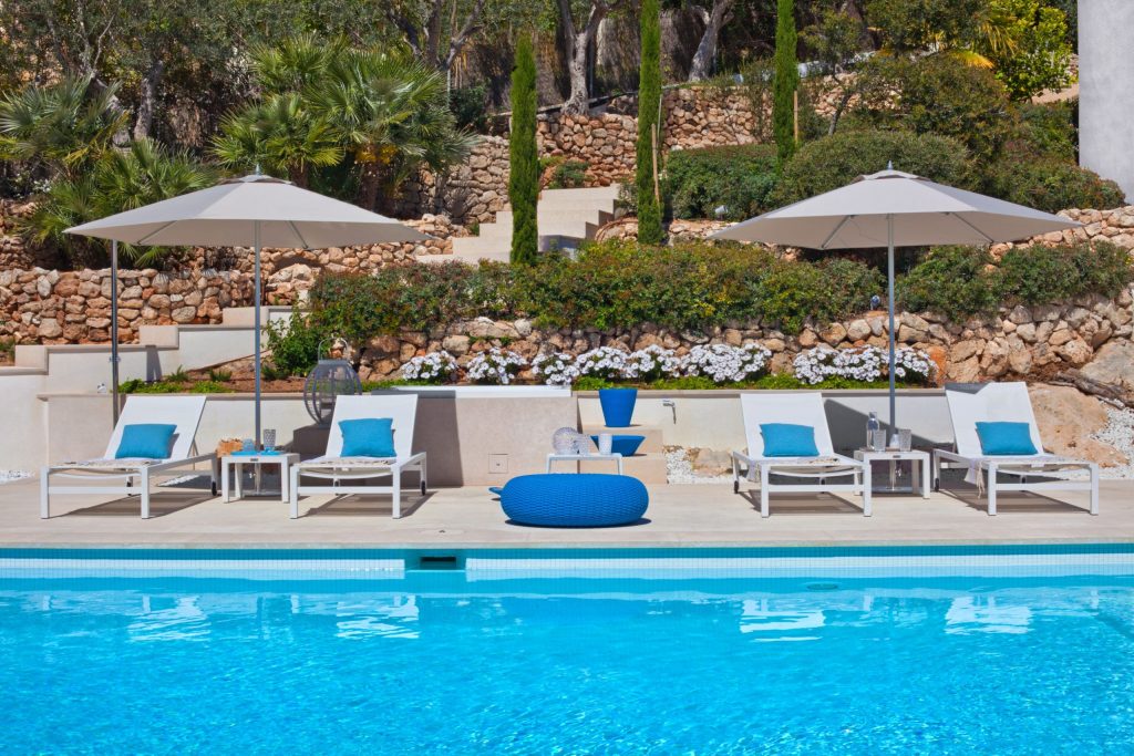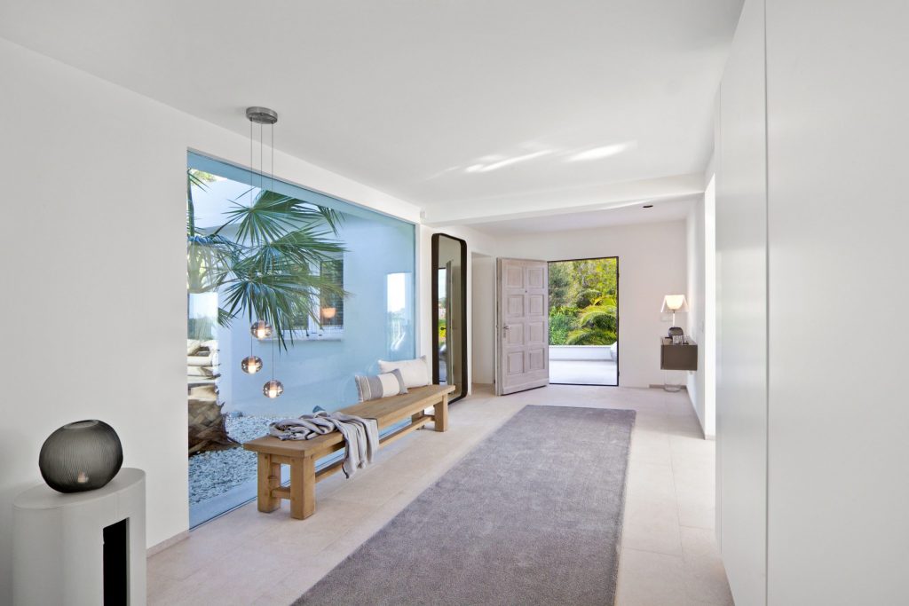 The exterior areas have been completely recreated and now feature a large bright terrace, with a stunning sapphire blue pool. This colour is also picked up in the detail of the poolside/ terrace furniture. The exterior wall facing the sea has been replaced with reinforced glass to maximize the sea views and enhance the spacious feel of the terrace. New landscaping with Mediterranean plants and palm trees completes the look of this striking residence.