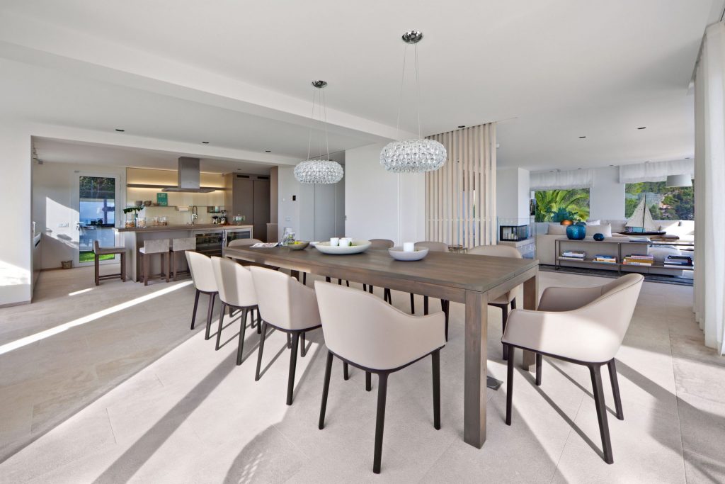 Throughout the main living areas and exterior terraces, a natural light coloured stone has been used to enhance the feeling of space and uniformity throughout the house. Upstairs in the bedrooms, a light-coloured wood floor provides contrast, texture and warmth.