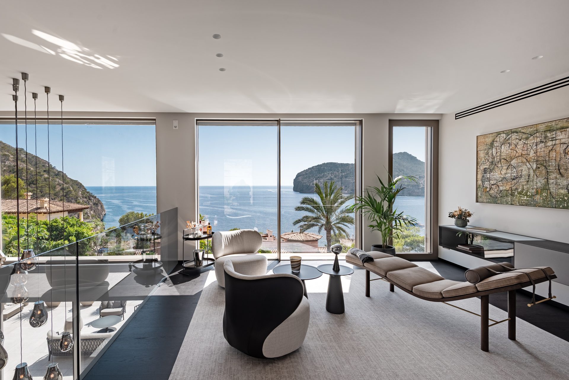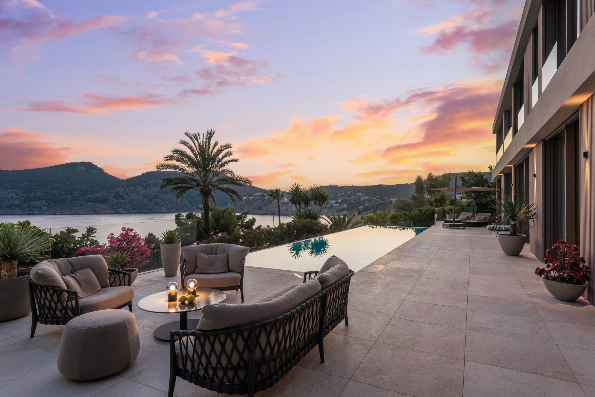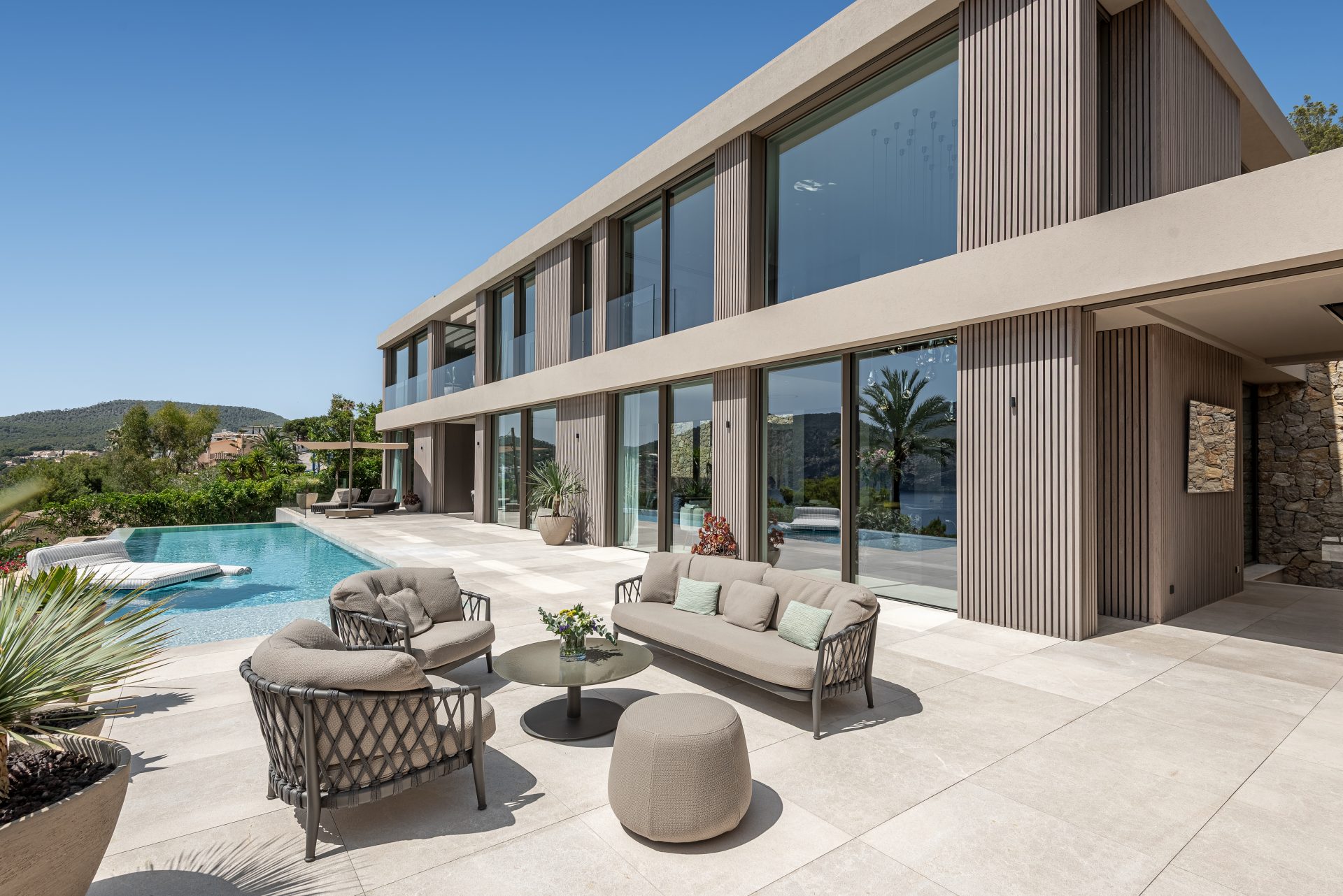 Es Salinar is built in a superior location with spectacular views over Camp de Mar, only a few minutes to the sandy beach and the golf court. Modern architecture uniquely connects the outsides with the interior. Natural stone in combination with wood elements and modern architecture turn this mansion into a truly special object.