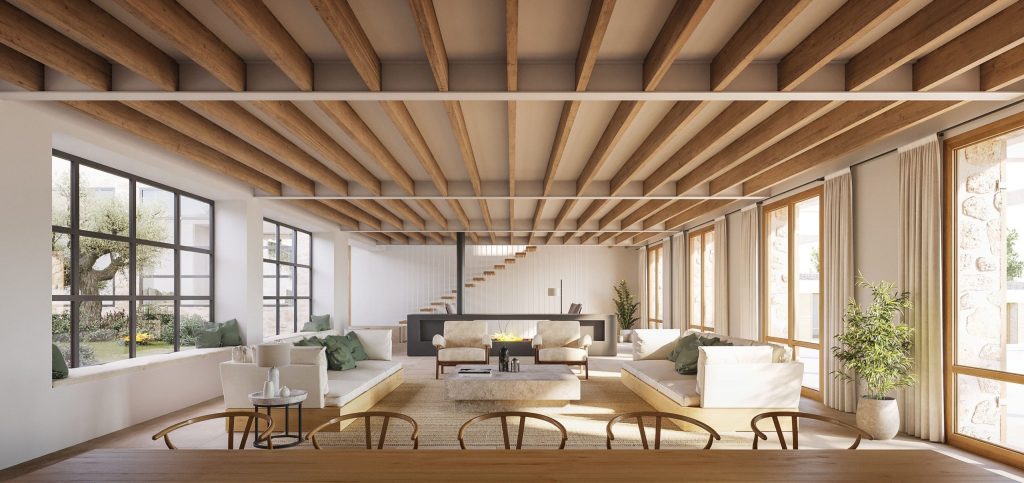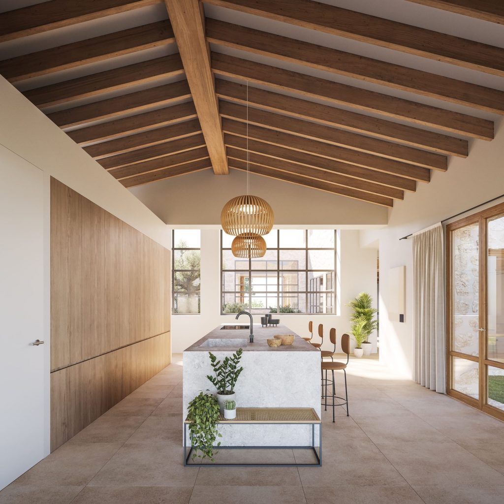 Ses Algorfes is a beautiful Finca in Calvià. It combines the character of an antique Mallorquin country house with modern elements. The villa convinces with its modern and open living concept with lots of light, spacious rooms and a comfortable atmosphere.