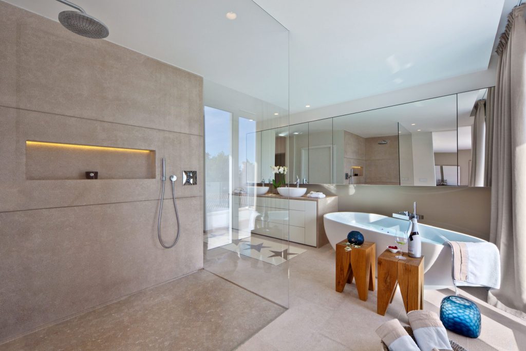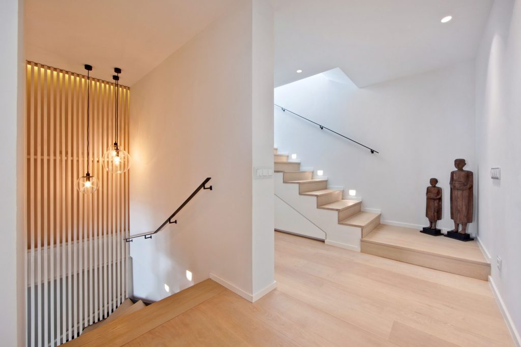 Throughout the main living areas and exterior terraces, a natural light coloured stone has been used to enhance the feeling of space and uniformity throughout the house. Upstairs in the bedrooms, a light-coloured wood floor provides contrast, texture and warmth.