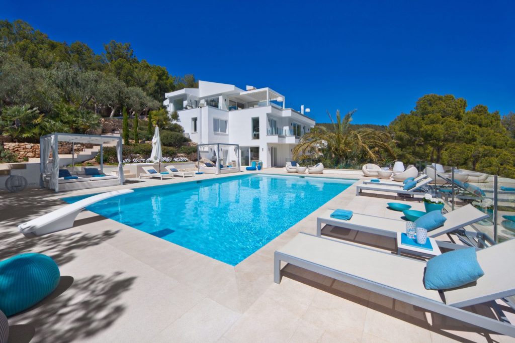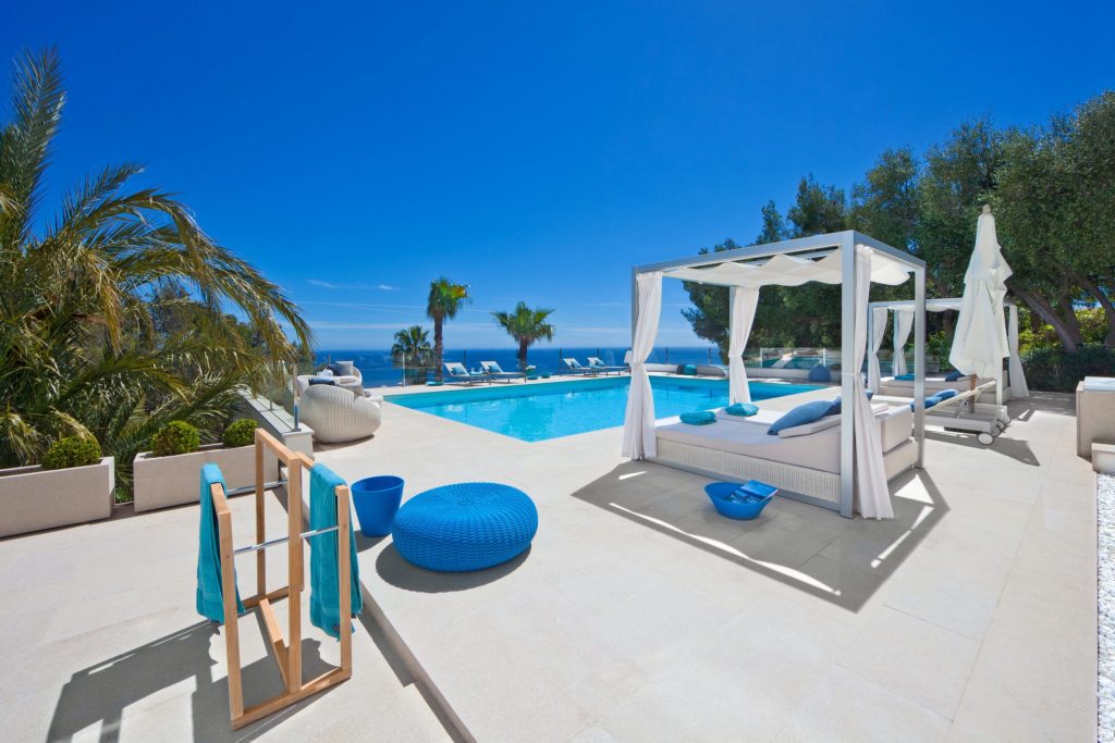 The exterior areas have been completely recreated and now feature a large bright terrace, with a stunning sapphire blue pool. This colour is also picked up in the detail of the poolside/ terrace furniture. The exterior wall facing the sea has been replaced with reinforced glass to maximize the sea views and enhance the spacious feel of the terrace. New landscaping with Mediterranean plants and palm trees completes the look of this striking residence.